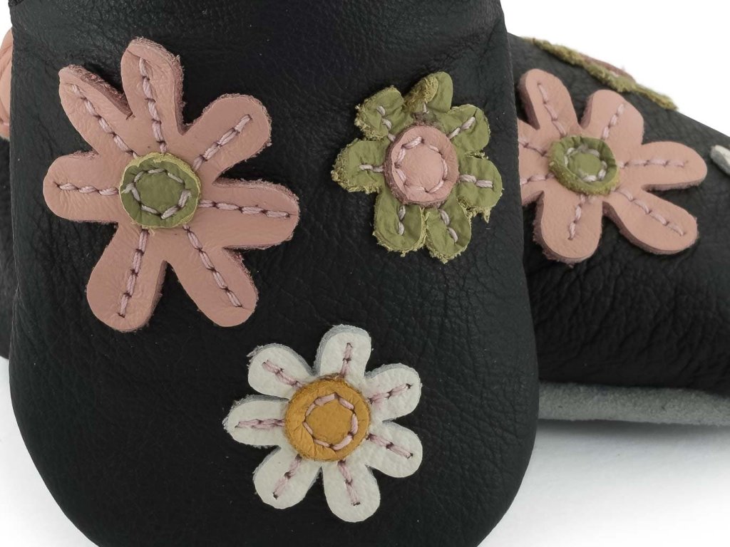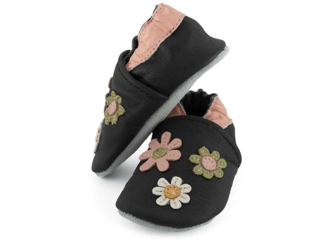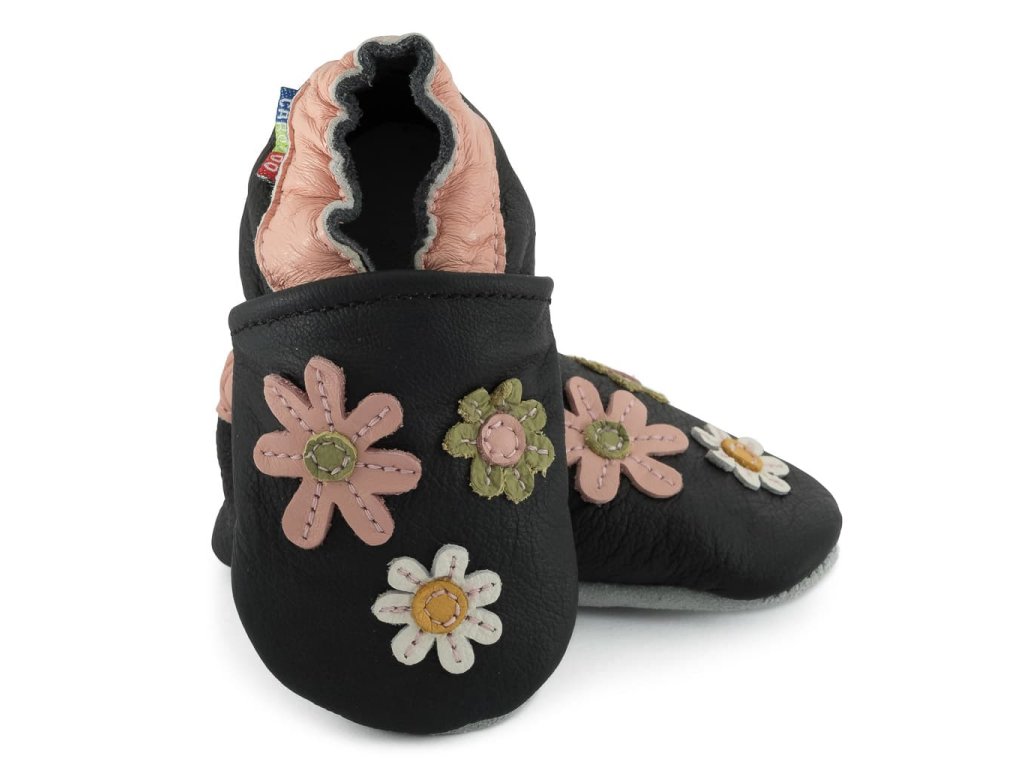 Kožené capáčky s koženou podrážkou černé s květinami CAROZOO