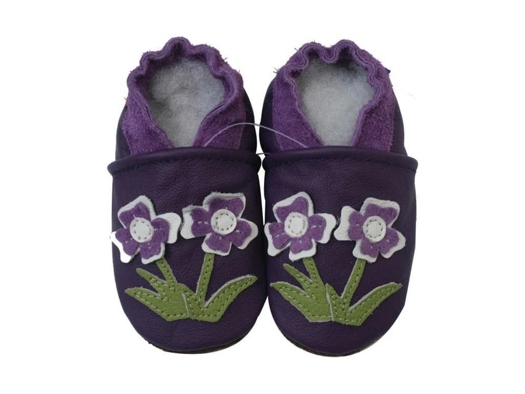 Kožené capáčky s koženou podrážkou fialové s fialkami CAROZOO