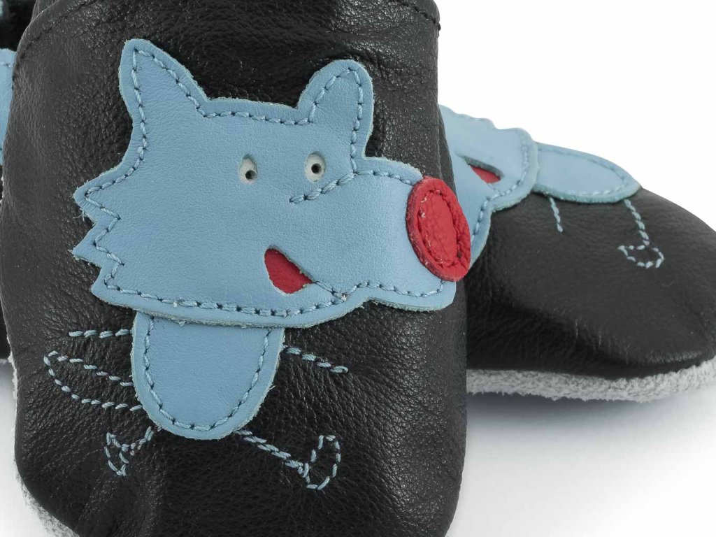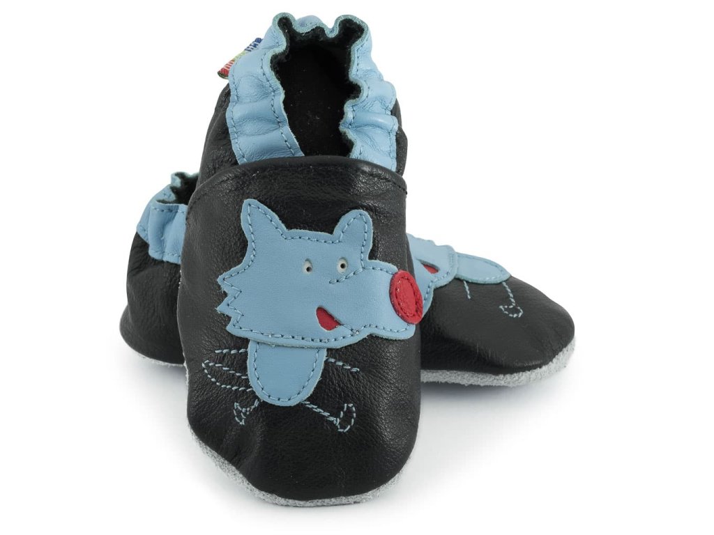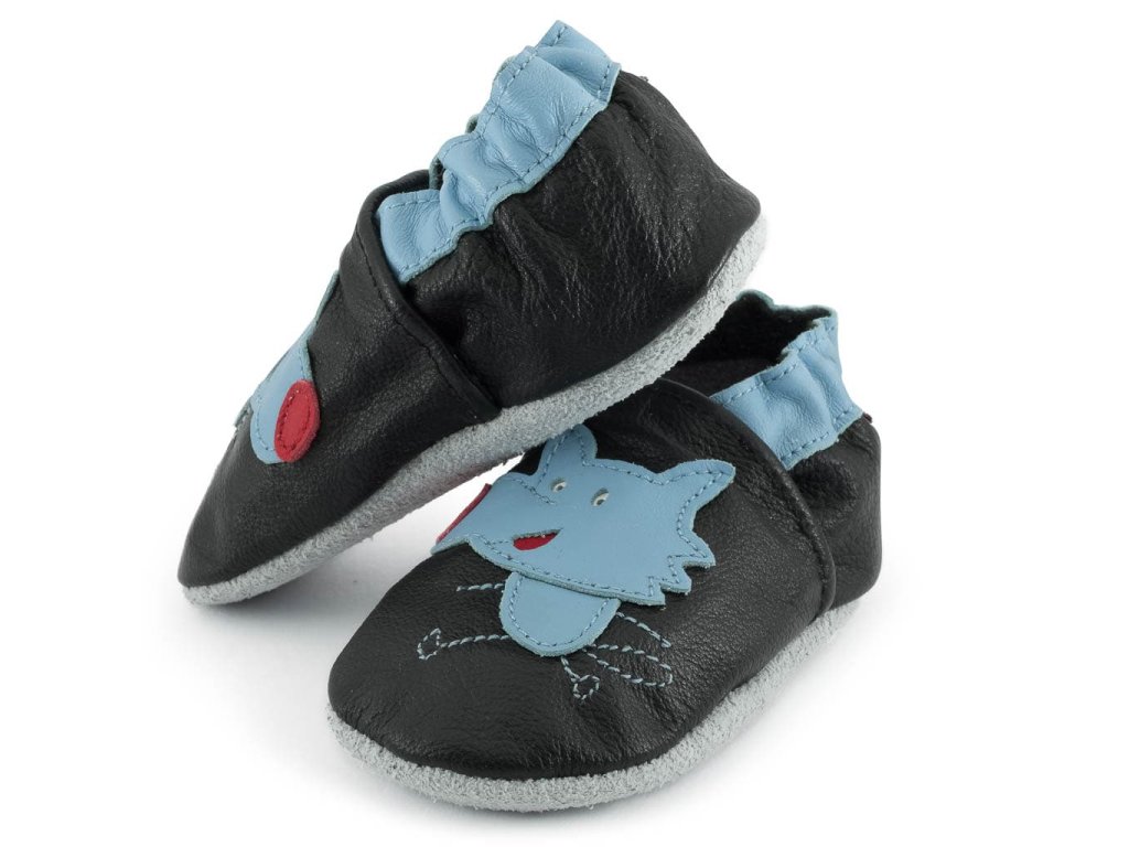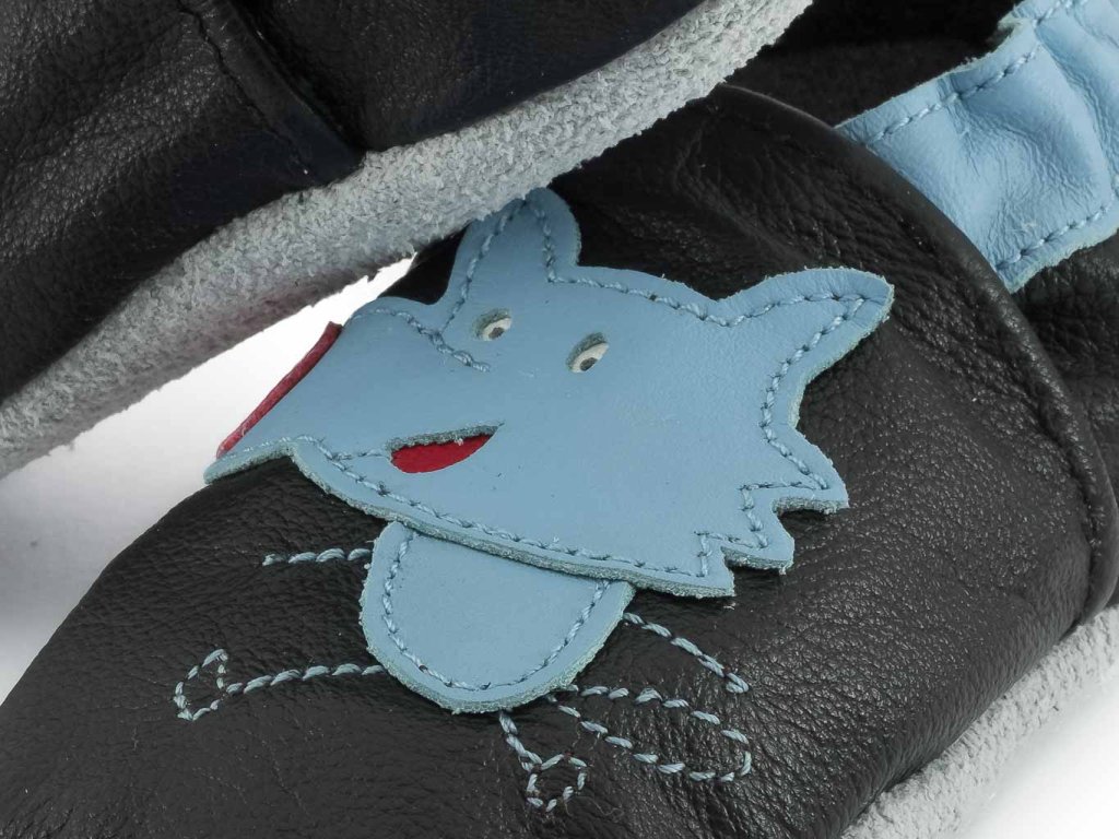 Kožené capáčky s koženou podrážkou vlk na černé CAROZOO