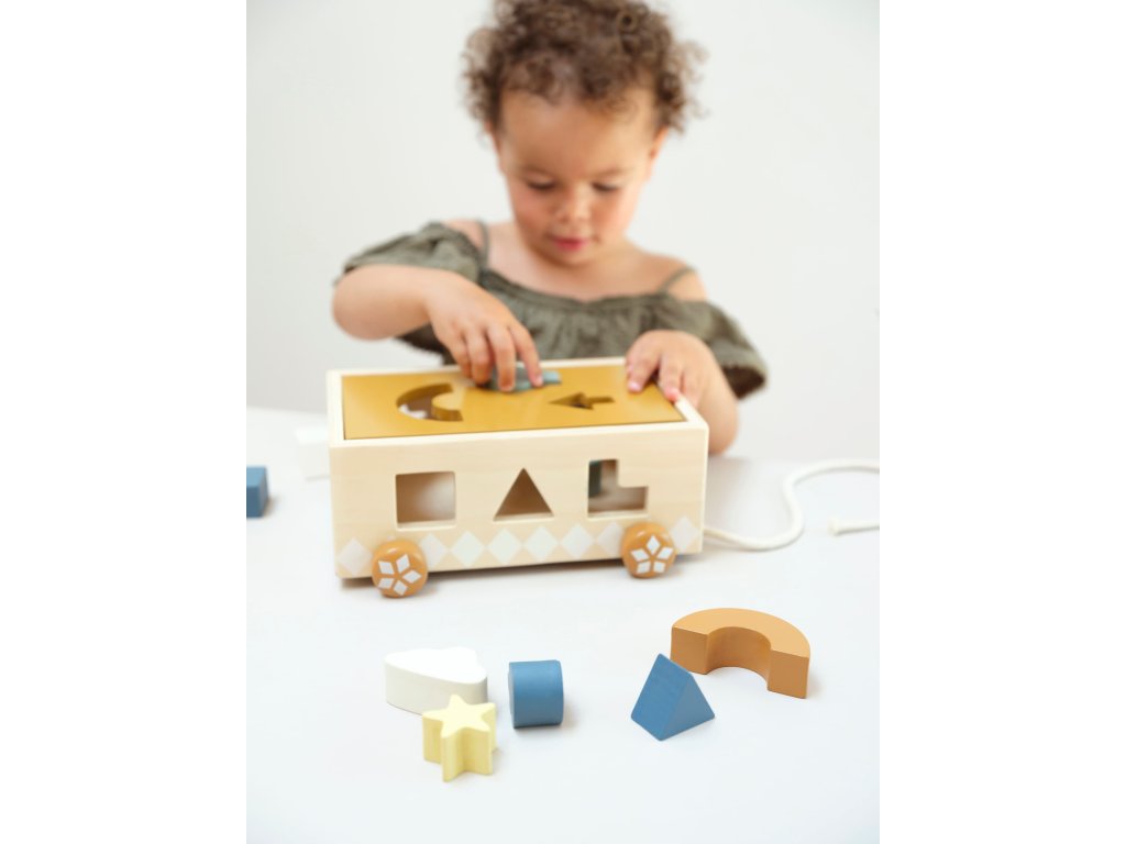 Obsah balení: dřevěný vozík a 11 geometrických tvarů